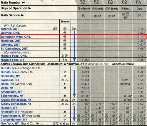 Amtrak timetable showing Burlington West Station (issued on January 15, 1989) (Source: timetables.org ©1989 National Railroad Passenger Corporation)