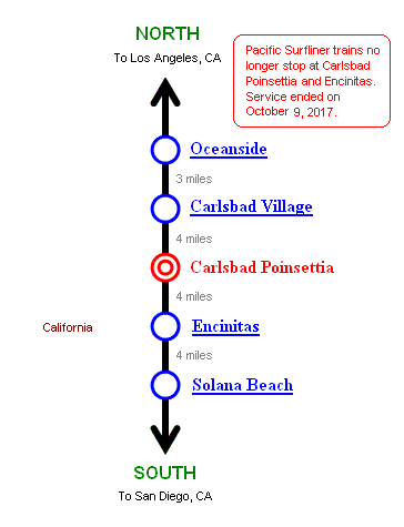 October 7, 2013, Amtrak Pacific Surfliner added four new stops, Sorrento Valley, Encinitas, Carlsbad Poinsettia and Carlsbad Village. But, Amtrak ended service to Encinitas and Carlsbad Poinsettia on October 9, 2017. |