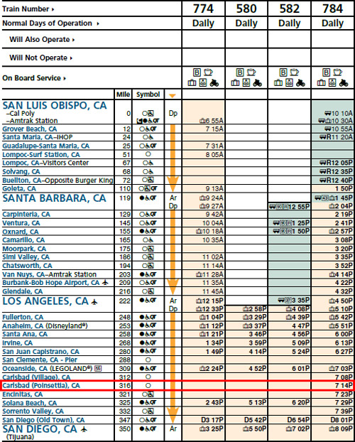 Amtrak timetable showing Carlsbad Poinsettia Station (issued on September 1, 2017) (Source: Amtrak.com ©2017 National Railroad Passenger Corporation) |