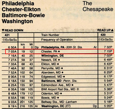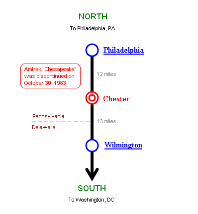 Note: Amtrak "Chesapeake" was discontinued on October 30, 1983, so Amtrak service to Chester ended. |
