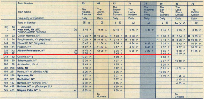 The last Amtrak timetable showing Colonie Station (issued on July 29, 1979) (Source: timetables.org ©1979 National Railroad Passenger Corporation) |