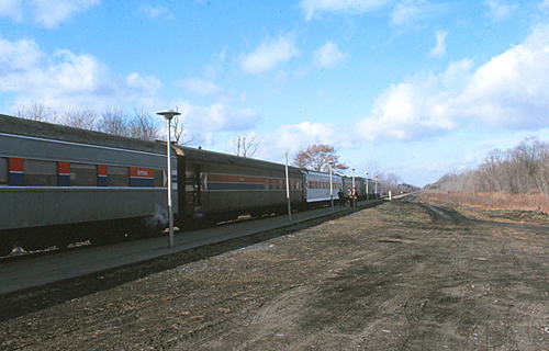 Amtrak eastbound train arriving at Colonie Station (December 1975)