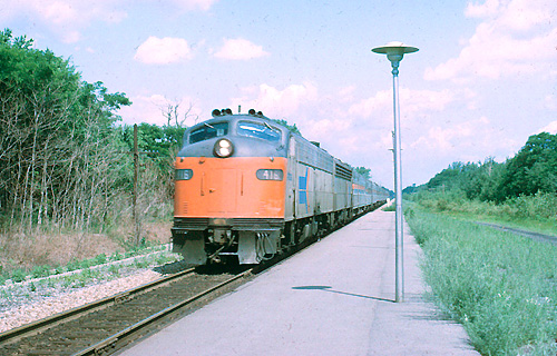 Amtrak eastbound train arriving at Colonie Station (June 1977)