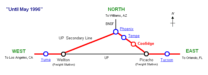 Sunset Limited (Los Angeles - Miami, currently Orlando) rerouted from a secondary line to a main line between Tucson and Yuma because Union Pacific Railroad (UP) abandoned the second line. Therefore, Amtrak no longer served directly Phoenix. Also Coolidge and Tempe stations located between Tucson and Phoenix were cut. The last trains served Phoenix on May 28, 1996. In the spring 2001 Maricopa station opened on the new route between Tucson and Yuma.