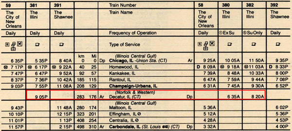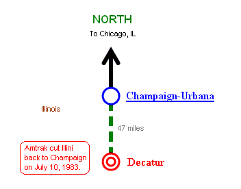 [ Chicago, IL - Champaign-Urbana, IL - Decatur, IL ] Note: Passenger service was cut back to Champaign, IL on July 10, 1983 |