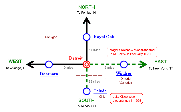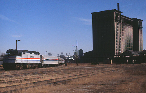 Amtrak Lake Cities entering the temporary Amtrak Detroit Station (February 1990) |