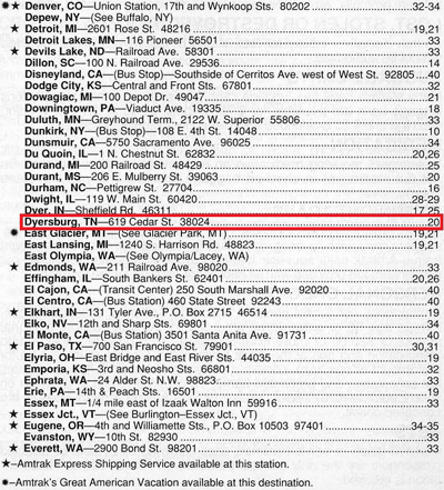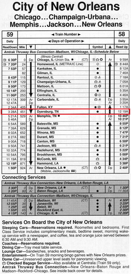 Amtrak timetable showing Dyersburg Station (issued on October 27, 1991) (Source: timetables.org ©1991 National Railroad Passenger Corporation) |