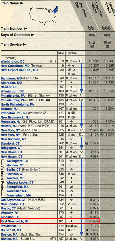 The last Amtrak timetable showing East Greenwich Station (issued on September 18, 1988) (Source: timetables.org ©1988 National Railroad Passenger Corporation)