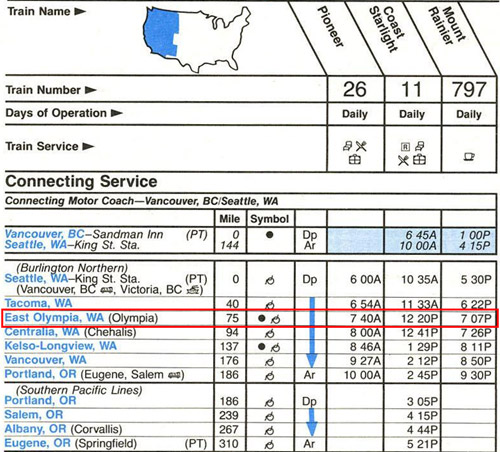 The last Amtrak timetable showing East Olympia Station (issued on April 1, 1990) (Source: timetables.org ©1990 National Railroad Passenger Corporation)