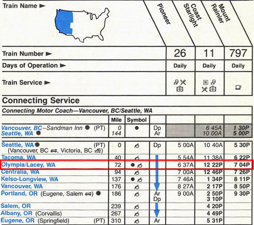 The first Amtrak timetable showing Olympia/Lacy Station (issued on October 28, 1990) (Source: timetables.org ©1990 National Railroad Passenger Corporation)