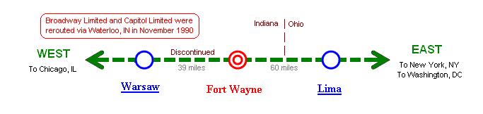 Note: Capitol Limited and Broadway Limited were rerouted via Waterloo, IN in November 1990 |