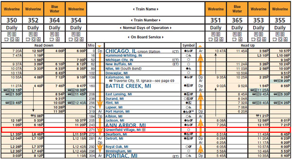 The last Amtrak timetable showing Greenfield Village Station (issued on June 9, 2014) (Source: ©2014 National Railroad Passenger Corporation) |