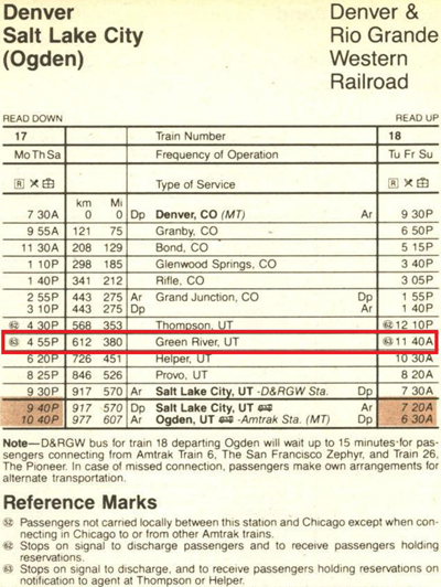 Source: timetables.org ©1983 National Railroad Passenger Corporation Amtrak timetable not showing Green River Station on the Amtrak California Zephyr route (issued on October 30, 1983)