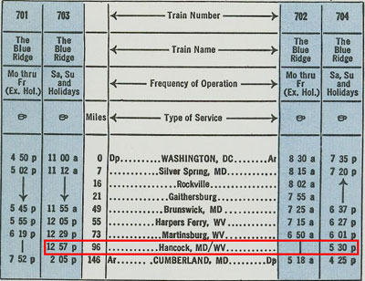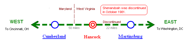 Amtrak Hancock, WV Station was located about 20 miles west of the Martinsburg, WV. Amtrak started operating Blue Ridge (DC - Cumberland) in May 1973, but the first Blue Ridge time table issued on June 10, 1963 did not show Hancock Station. Amtrak Timetable issued on October 28, 1973 first showed Hancock Station (please see below). When Shenandoah (DC - Cincinnati) was introduced on October 31, 1976, Blue Ridge between Cumberland and Martinsburg was truncated. At that time, the first Shenandoah timetable issued on October 31, 1976 did not show Hancock Station (not sure if Shenandoah really had not stopped Hancock). Amtrak Timetable issued on February 3, 1980 showed Hancock Station again (please see below). Amtrak ended service to Hancock in October 1981 due to discontinuance of Shenandoah. At the same time, Amtrak introduced new service, Capitol Limited (DC - Chicago) running over the same route between DC and Cumberland, but the trains no longer stop at Hancock.