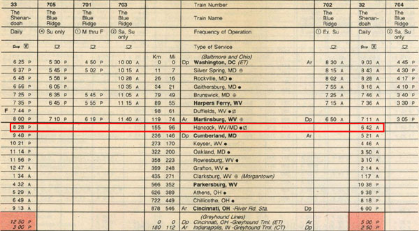 Amtrak Shenandoah timetable showing Hancock Station (issued on February 3, 1980) (Source: timetables.org ©1980 National Railroad Passenger Corporation) |