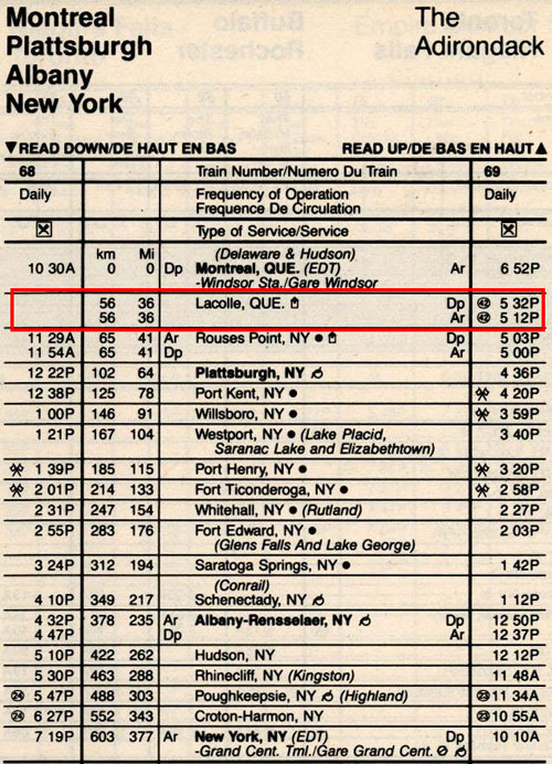The last Amtrak timetable showing Lacolle Customs Stop (issued on April 28, 1985) (Source: timetables.org ©1985 National Railroad Passenger Corporation)