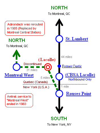 Amtrak Lacolle Customs Stop was initially used on the old Adirondack route (to Montreal Windsor Station) until 1985. After rerouted to the current route in 1985, Lacolle was replaced by Cantic. The former Lacolle Customs Stop was located 5 miles north of Rouses Point, NY.