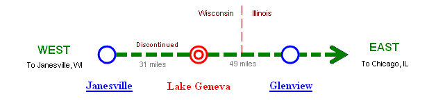 On April 15, 2000, Amtrak returned service to Janesville. Two months later (June 13, 2000), Lake Geneva Station opened between Janesville, WI and Glenview, IL. The station was located on a small town, Zenda, a few miles south from most of Lake Geneva and its major resort. The trains, Lake Country Limited (#343 and #344), ran one round trip daily first. Then, the service was reduced once a week on March 24, 2001 (Saturdays only). Finally, Lake Country Limited was eliminated on September 23, 2001. Lake Country Limited was really short-lived trains. |