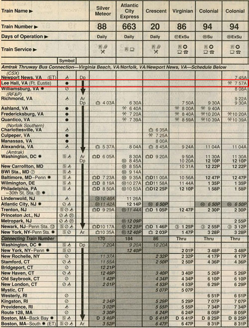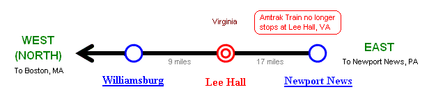 Note: Amtrak trains have no longer stopped at Lee Hall, VA since 1992 |