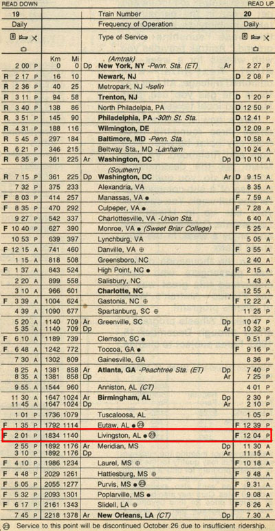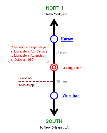 Note: Crescent no longer stops at Livingston, AL (Service to Livingston, AL ended in October 1980) |