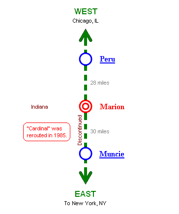 Note: Cardinal was rerouted in April 1986 and Marion was not served by Amtrak. |