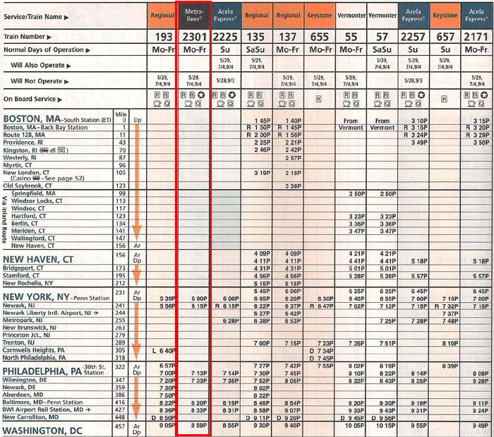 Note: Metroliner did not stop the stations in parentheses ( ). Only Amtrak stations are listed. Commuter Train Stations are not shown. |