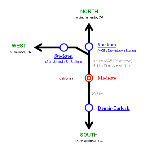 Modesto Amtrak Station was moved from Riverbank Station on November 1, 1999. Amtrak Trains, San Joaquins no longer stop at Riverbank. Modesto station is located 4 miles south from Riverbank. For more detail about Riverbank station, click HERE. |