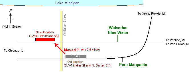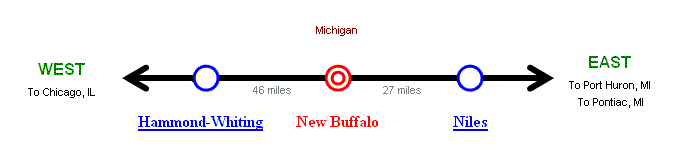 On October 26, 2009, new Amtrak "New Buffalo" station opened and is located at 225 North Whittaker St., New Buffalo, MI. The Amtrak Station Code also has changed from "NBM" to "NBU". Wolverine and Blue Water provide service to/from New Buffalo. Pere Marquette no longer stops at New Buffalo. The New Buffalo stop was relocated from the CSX (Pere Marquette) line to the Amtrak-owned (Wolverine/Blue Water) line. The new location is in a more attractive, downtown area. For more detail, click HERE.