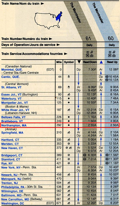 The Montrealer timetable showing Northampton Station (issued on April 5, 1987) (Source: timetables.org ©1987 National Railroad Passenger Corporation) |