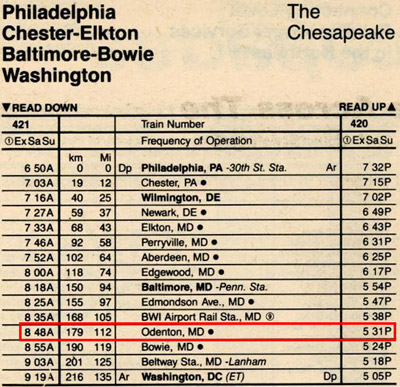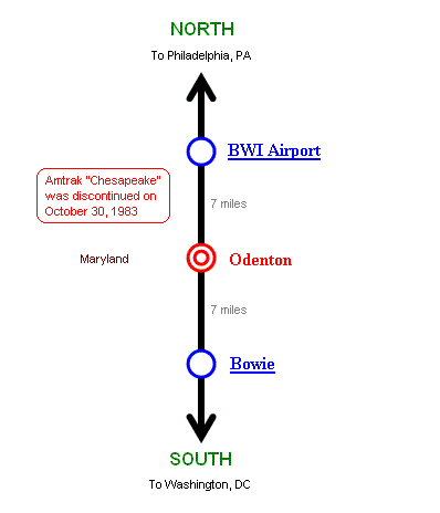 Note: Amtrak "Chesapeake" was discontinued on October 30, 1983, so Amtrak service to Odenton, MD ended. Currently MARC serves Odenton Station. |