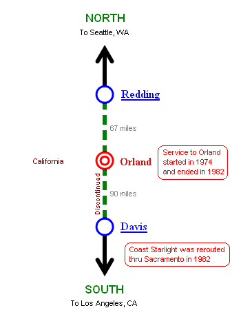 Amtrak Station Orland, CA was located between Davis, CA and Redding, CA (67 miles south of Redding). Since 1982 Coast Starlight has no longer stopped at Orland, CA.