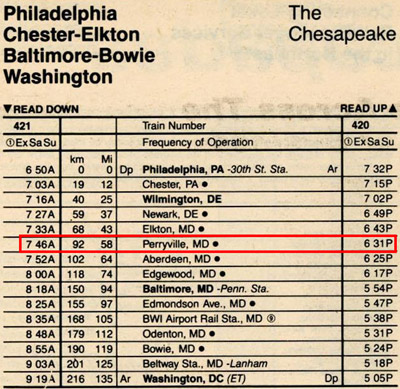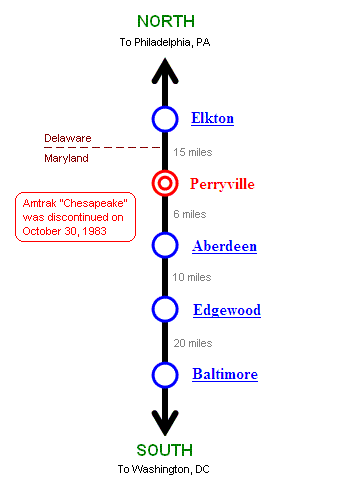 Note: Amtrak "Chesapeake" was discontinued on October 30, 1983, so Amtrak service to Edgewood ended. Currently only weekday southbound Amtrak NE Regional Train #151 stops at Perryville, MD as MARC commuter service. |
