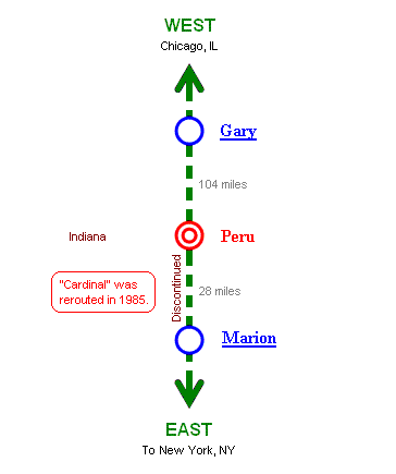 Note: Cardinal was rerouted in April 1986 and Peru, IN was not served by Amtrak. |