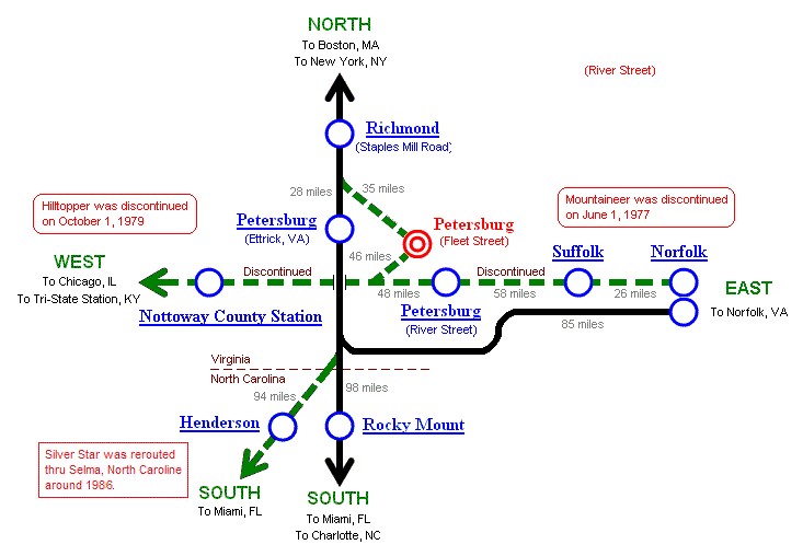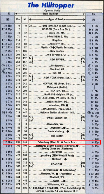 Amtrak timetable showing Petersburg Fleet St. Station (issued on January 8, 1978) (Source: timetables.org ©1978 National Railroad Passenger Corporation) |