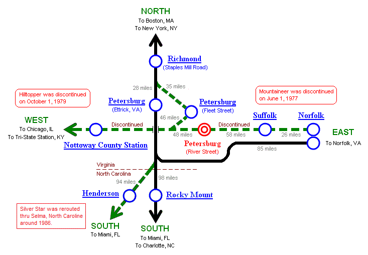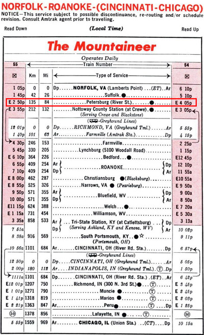 The last Amtrak timetable showing Petersburg River St. Station (issued on May 1, 1977) (Source: timetables.org ©1977 National Railroad Passenger Corporation)