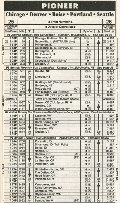 The last Amtrak timetable showing "Pioneer" (issued on November 10, 1996) (Source: timetables.org ©1996 National Railroad Passenger Corporation)