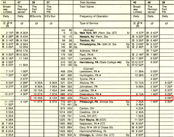 Amtrak timetable showing Wilkinsburg Station (issued on October 31, 1982) (Source: timetables.org ©1982 National Railroad Passenger Corporation) |