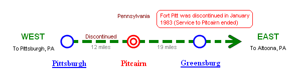 Amtrak Pitcairn Station was located 12 miles east of the Pittsburgh Station. Amtrak Service to Pitcairn Station ended in January 1983 due to discontinuance of Fort Pitt. Since then, no Amtrak trains have stopped at Pitcairn.