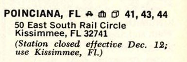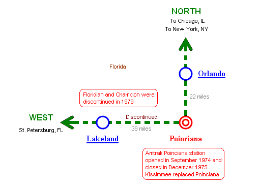Amtrak Poinciana station opened in September 1974 and closed in December 1975. Kissimmee located about 4 miles east replaced Poinciana. |
