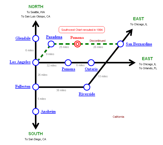 [ Chicago, IL - Albuquerque, NM - Los Angeles, CA ] Southwest Chief was rerouted in January 1994. |
