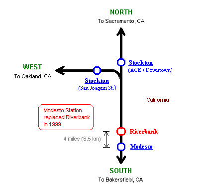 [ Sacramento, CA - Stockton, CA - Fresno, CA - Bakersfield, CA ] Note: Modesto Station replaced Riverbank in 1999. |