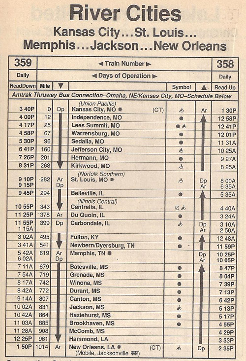 (X): Eliminated stations River Cities was combined with City of New Orleans between Carbondale, IL and New Orleans, LA, and combined with Mules between Kansas City, MO and St. Louis, MO. |