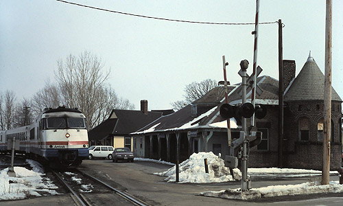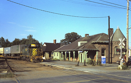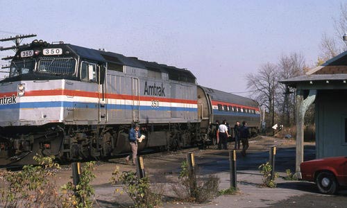 Delaware Hudson GP39-2 7409 passing Amtrak Rouses Point Station (September 1978)