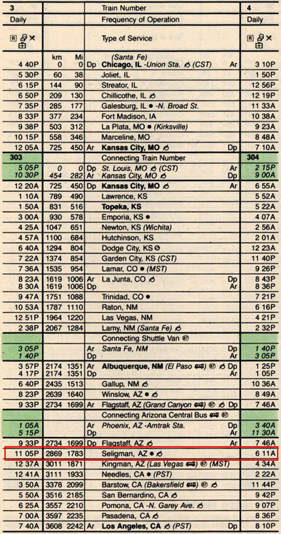 The last Amtrak timetable showing Seligman Station (issued on October 28, 1984) (Source: timetables.org ©1984 National Railroad Passenger Corporation) |