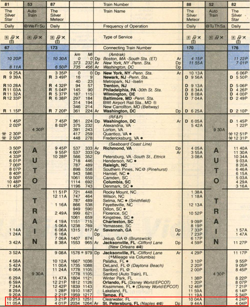 The last Amtrak timetable showing Silver Service to St. Petersburg (issued on October 30, 1983) (Source: timetables.org ©1983 National Railroad Passenger Corporation) |