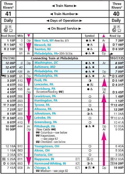 The last Amtrak timetable showing "Three Rivers" (issued on November 1, 2004) (Source: timetables.org ©2004 National Railroad Passenger Corporation)