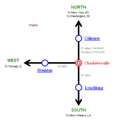 の路線を平面交差で横切り、シャーロッツビル駅の1番線に到着し、その後オレンジ貨物駅へ向けて北進します。 このカーディナル号とクレセント号の別路線運行はアムトラックの時刻表をよく見ると発見することが出来ます。 確かにアムトラックの路線図だけを見てもこれは発見できないのですが、カーディナル号とクレセント号それぞれの時刻表をよく見ると違いが分かります。 時刻表の駅名の横にマイレージが載っているのですが、そのシャーロッツビルとカルペパー間の距離がカーディナル号とクレセント号では違っています。 その時刻表によるとカーディナル号の方が5キロほどクレセント号より長い距離表示になっていて、カーディナル号は東へ迂回しているので、その分長いということは辻褄が合います。 細かい芸当をしているなと、この時は少し感心しました。 ただしこのような距離表示の相違は単なるミスプリントと考えてしまう人も多いと思いますが。 最後にこの駅が持っているアムトラックのナンバーワンを紹介します。 「Charlottesville」 の字数(アルファベット)を数えると15字になり、これはアムトラックの中にある単語ひとつの駅名の中では最も字数の多い駅ということになります。 日本では最も長い駅名というのは鉄道ファンから結構注目を浴びますが、アメリカではそれほど騒がれるものではないようです。 |