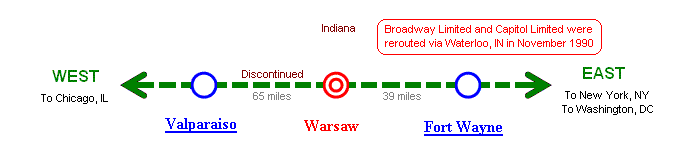 Note: Capitol Limited and Broadway Limited were rerouted via Waterloo, IN in November 1990 |