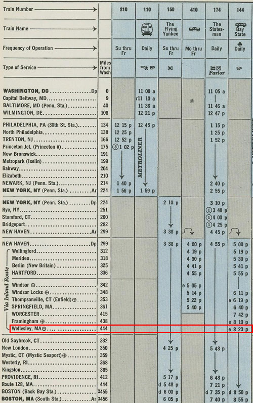 Amtrak timetable showing Wellesley Station (issued on November 15, 1974) Amtrak service to Wellesley was once discontinued in 1975. (Source: timetables.org ©1974 National Railroad Passenger Corporation)