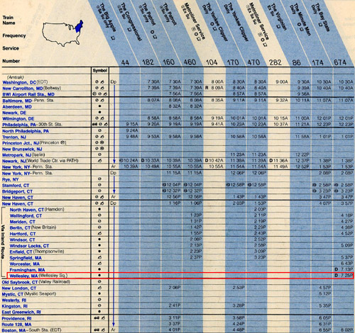 The last Amtrak timetable showing Wellesley Station (issued on April 27, 1986) Amtrak resumed service to Wellesley in 1984, but discontinued around 1986. (Source: timetables.org ©1986 National Railroad Passenger Corporation)